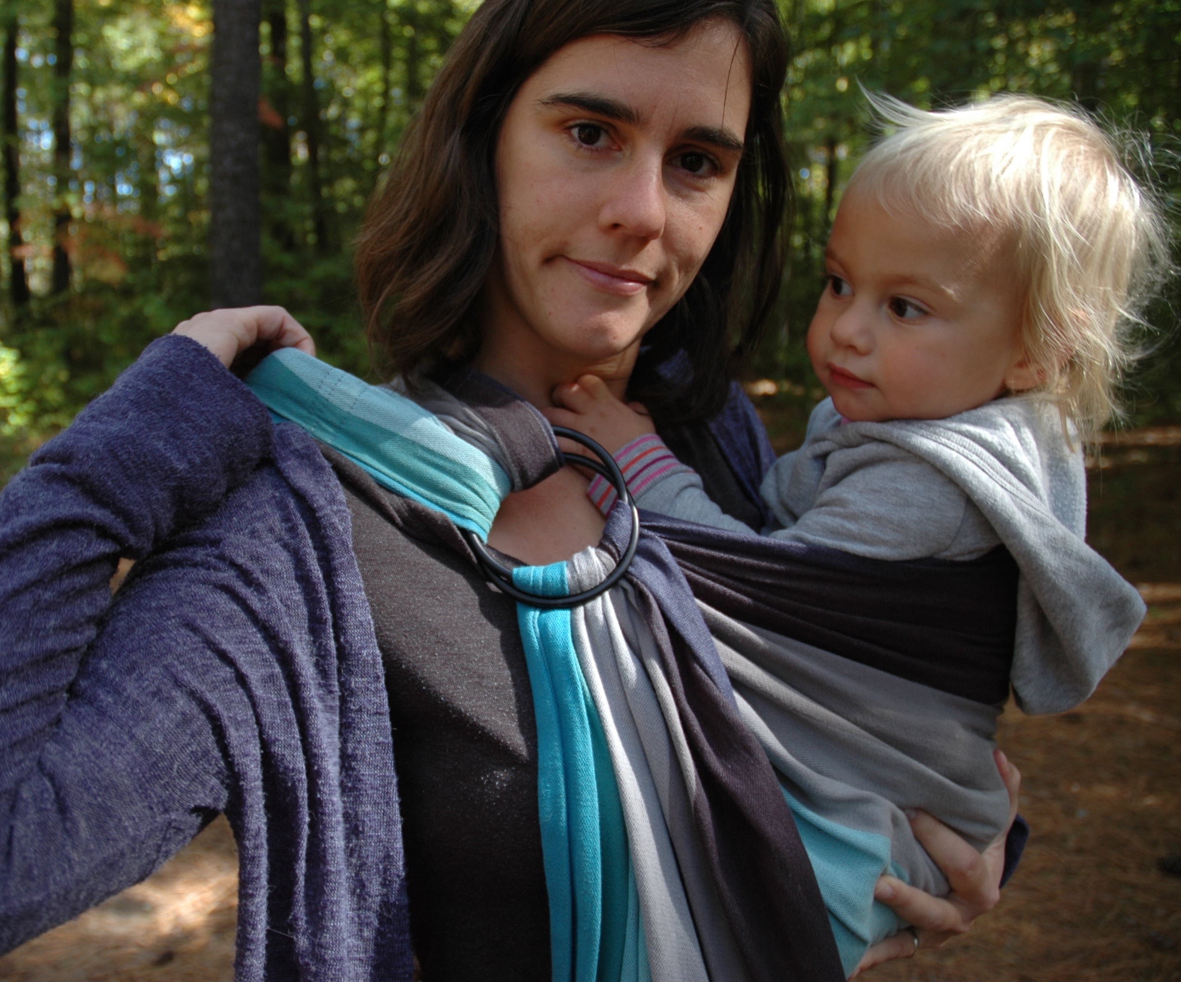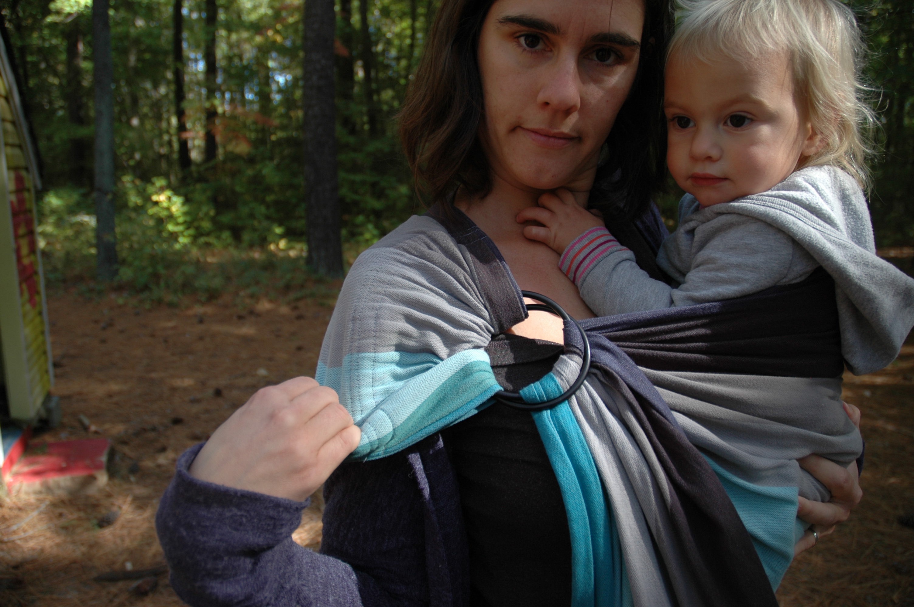 Another simple adjustment that people often need is just to tighten a tad more. Often there will be a little pocket of slack caught just under the wearer’s arm or sometimes caught right by the baby’s leg. If you feel like your baby’s legs are uneven, you probably have a bit of slack behind the leg that is opposite the rings. Taking a moment to feel around for excess slack and tighten just that strand will help make a perfect fit around baby.