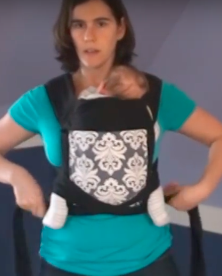 Step 10: Bring both shoulder straps over your shoulders. Keep a hand on baby while you do this.